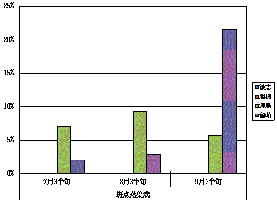 りんごの斑点落葉病:発病葉率 (3樹・各新梢葉100枚調査)