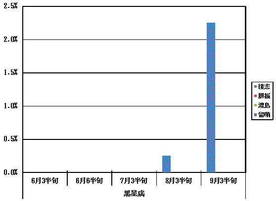 りんごの黒星病:発病葉率 (3樹・各新梢葉100枚調査)