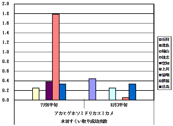 水稲のアカヒゲホソミドリカスミカメ:水田20回振りすくい取り成・幼虫数