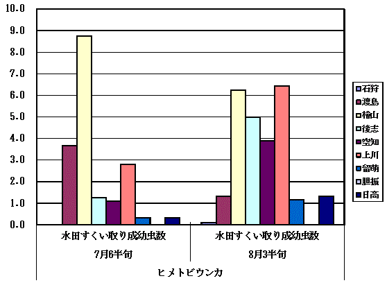 水稲のヒメトビウンカ:水田20回振りすくい取り成・幼虫数