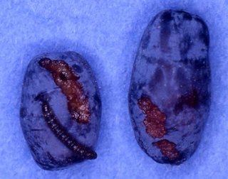 平成19年6月下旬から7月上旬に、胆振支庁管内厚真町のハスカップ園4園地で収穫したハスカップ果実から鱗翅目幼虫と顆粒状の虫糞が発見された。出荷前の検品作業中に果実中に黒色で体長1cm弱の小型の鱗翅目幼虫が認められ、この幼虫が内部を食害したと思われる被害果は表皮が萎縮していた。数日以内に、被害果実に孔をあけて幼虫が脱出すると共に虫糞を排泄することにより、被害果を含むパック単位で価値を損ねた。7月上旬に当該果実を収穫した園地を調査したところ、園地内の多くの樹に絹糸でクモの巣状に営巣した葉巻症状が認められ、その近くの果実に被害が多く認められた。 発見された幼虫にハスカップ葉・果実を与えて飼育したところ、葉や果実内部に対する食害は観察されず、果実の表面を溝状にかじり削る症状が認められ、7月下旬に体長 6mm程度の小型の蛾が羽化した。成虫の体色は明るい黄褐色で、翅には明るい褐色から暗褐色の複雑な模様が認められる。この成虫は、奥 俊夫博士(盛岡市)により、ハマナスホソバヒメハマキ Lobesia yasudai Bae et Komaiと同定された。本種を含む Lobesia 属は一般に花や果実を食害することが多い。一方、巻いた葉やキク科植物の頭花、果実のヘタの部分や害虫による加害により傷ついた部位など、狭い隙間のある場所を好んで摂食する性質があり、植物の種類だけでなく形状でも餌を選択しているものと思われる。発生園地は山林に接したり周囲を樹林に囲まれたりしており、このような環境で被害が多発する可能性がある。 (病害虫防除所・胆振農業改良普及センター本所・同東胆振支所) |