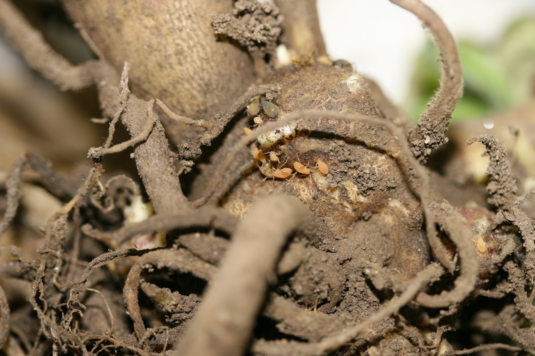 令和元年10月中旬、函館市の家庭菜園において生育が停滞していたヤーコンを掘り起こしたところ、塊根の肥大も進んでおらず、地際部と塊根に多数のアブラムシとこれに随伴するアリが確認された。発生したアブラムシは帯広市の鳥倉英徳氏によりヨモギスネナガアブラムシProtrama radicis (Kaltenbach)と同定された。また、随伴していたアリはキイロケアリLasius flavus (Fabricius)であった(北海道植物防疫協会、大久保利道氏同定)。ヨモギスネナガアブラムシが属するスネナガアブラムシ類は、主にキク科などの草本の根部に生息し、アリに随伴し無性世代が土中越冬するとされている。