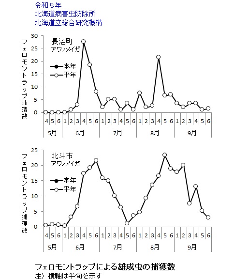 | ヨトウガ | 産卵数・食害程度 | 産卵(第1回) 長沼:(6.Ⅲ) 芽室:(6.Ⅱ) 訓子府:(6.Ⅳ) |