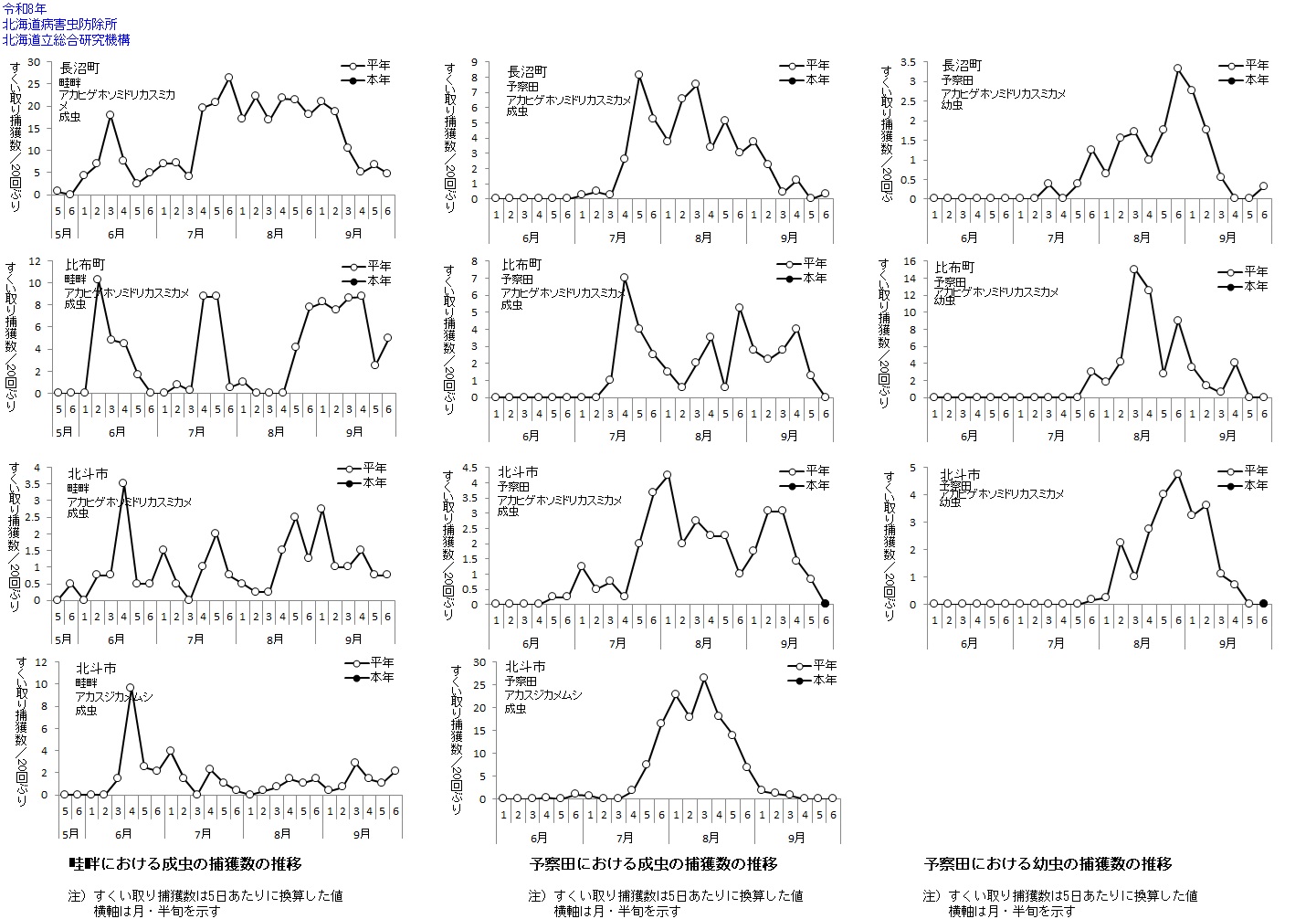 | 斑点米カメムシ類 | すくい取り数 | アカヒゲホソミドリカスミカメ 畦畔すくい取り(第1回成虫) 長沼:(6月5日) 比布:(6月11日) 北斗:(6月9日) |